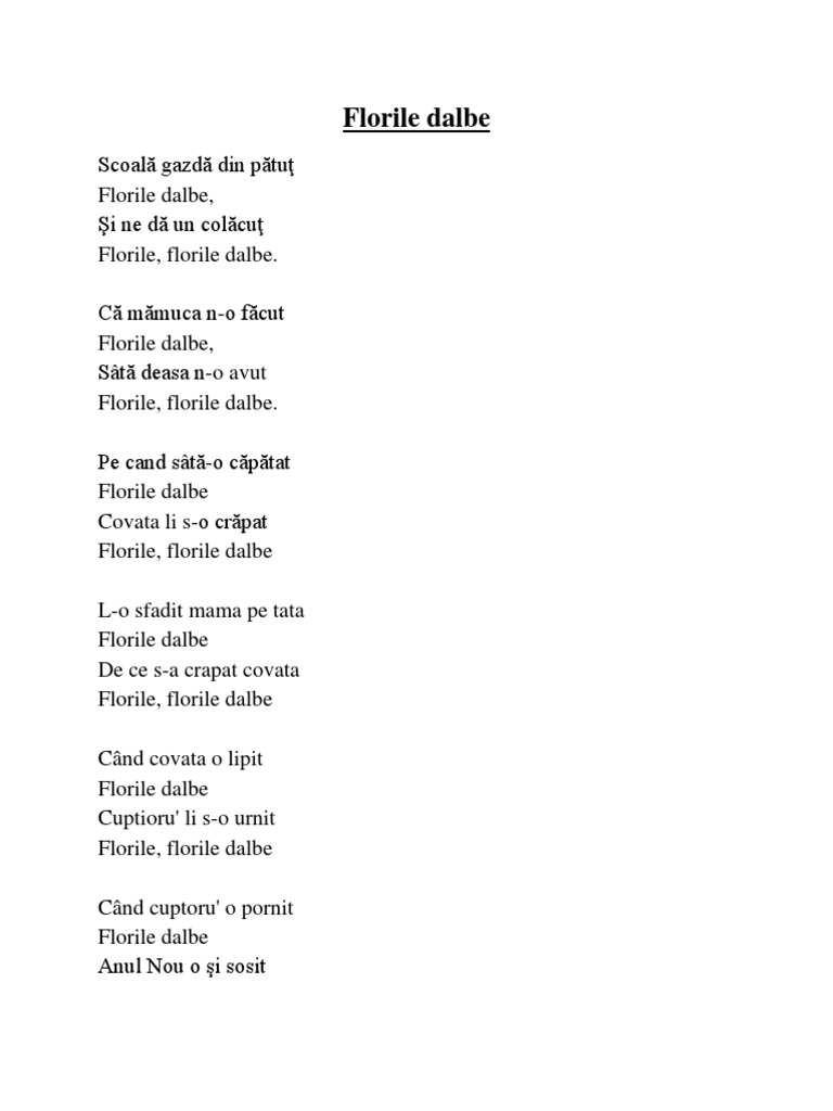 Pe cand sita o capatat florile dalbe covata i s o crapat florile florile dalbe l o sfadit mama pe tata florile dalbe di ce s o crapat covata. Scoală gazdă din pătuț florile dalbe și ne dă un colăcuț florile dalbe. Tralala versuri scoala gazda din patut florile dalbe scoala gazda din patut florile dalbe si ne da un colacut florile dalbe. L a sfadit mama pe tata florile dalbe ca no reparat covata florile florile dalbe.