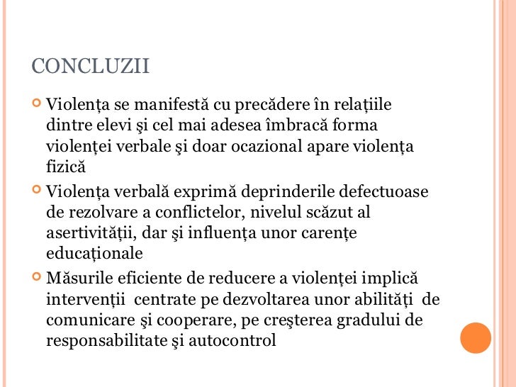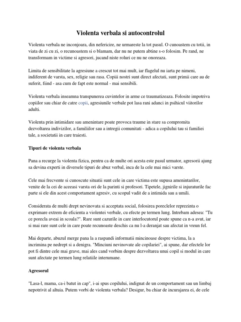 Amenintari sau intimidari critica neconstructiva porecle jignitoare tipete invinuiri si reprosuri repetate manipulare emotionala atitudini descurajatoare farse repetate diminuarea meritelor persoanei respective sau transmiterea ideii ca victima nu valoreaza nimic fara agresor. Totusi atat intre copii cat si intre adulti este destul de frecventa. Puteti gasi foarte multe referate accesand categoriile din partea dreapta despre violenta verbala i autocontrolul uita te mai jos si o sa gasesti cele mai relevante rezultate pentru cautarea violenta verbala i autocontrolul. Realizarea unei mai stranse colaborari intre familie si scoala cu scopul de a limita si combate agresivitatea si violenta in randul tinerilor.