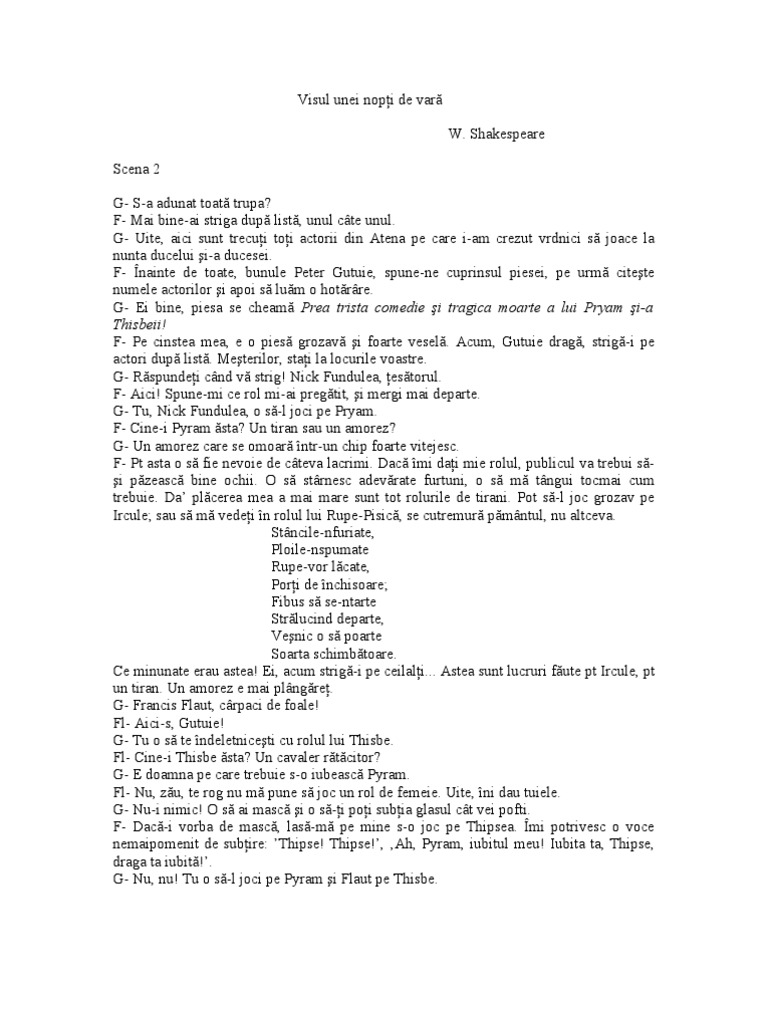 Două perechi de îndrăgostiţi sunt purtaţi prin pădure pe aripi de magie de către un spiriduș gânditor şi imprevizibil. Visul unei nopti de vara comedia dragostei a cincea comedie shakespeariana infatiseaza raportandu se indirect la romeo si julieta ca amprenta a variabilitatii diametral opuse o tema fundamentala a mult valorificatului scriitor care nu poate fi alta decat dragostea. Că ne mâneam unii pe alţii. Că nu eram nemuritori.