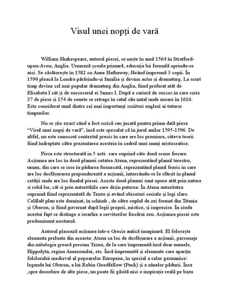 Visul unei nopti de vara rezumat. William shakespeare visul unei nopti de vara rezumat by irina ionescu 2 in book excerpts. Visul unei nopți de vară conform originalului din engleză a midsummer night s dream este o comedie romantică a dramaturgului englez william shakespeare scrisă în anii 1595 96 acțiunea prezintă aventurile a patru iubiți din atena și a unui grup de actori amatori într o pădure luminată feeric de lună și relațiile care se creează între personajele umane și spiridușii care. Cel al tinerilor îndrăgostiţi al conflictului dintre conducătorii zânelor şi cel de al treilea care surprinde trupa de actori pregătind punerea în scenă a unei piese cu ocazia căsătoriei ducelui atenei theseu cu hippolyta regina amazoanelor. Rezumat visul unei nopți de vară e o piesă de teatru scrisă de william shakespeare într o perioadă creativă foarte bogată a acestuia.