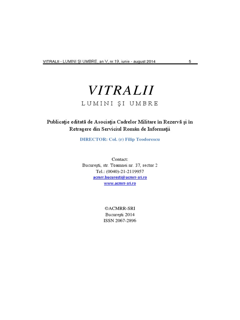 Revista vitralii lumini și umbre numărul 40. Revista trateaza teme referitoare la cultura de securitate nationala si internationala cultura organizationala si memorialistica profesionala avand un continut bogat de texte ce cuprind informatii din sfera serviciilor secrete care fascineaza in general publicul larg. Din s r i director colonel r filip teodorescu. Primul numar al acesteia a vazut lumina tiparului in anul 2009.