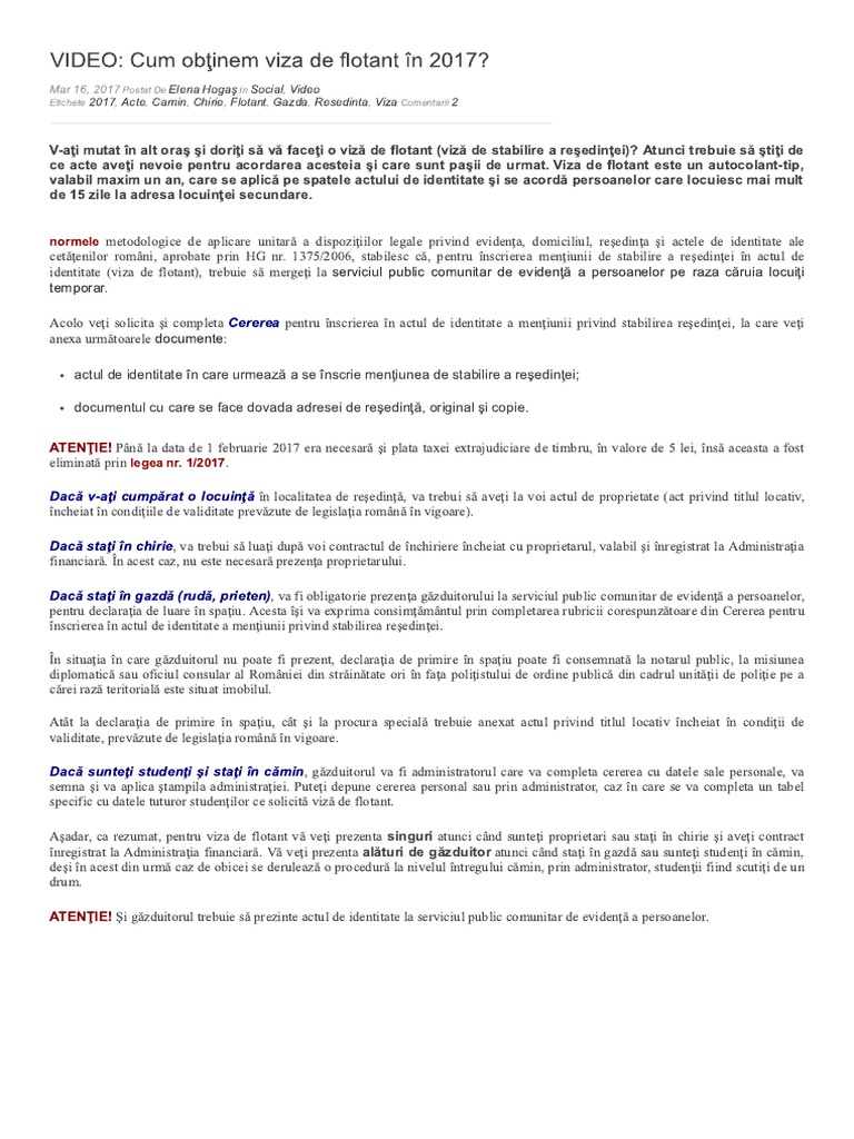 1375 2006 stabilesc că pentru înscrierea menţiunii de stabilire a reşedinţei în actul de identitate viza de flotant trebuie să mergeţi la serviciul public comunitar de evidenţă a persoanelor pe raza. Cererea pentru viză de flotant poate fi descarcată la finalul articolului. Menţiunea privind stabilirea reşedinţei se înscrie la cererea persoanei fizice care locuieşte mai mult de 15 zile la adresa la care are locuinţa secundară. De ce acte aveti nevoie în 2017 pentru a obtine viza de flotant viza de stabilire a resedintei.