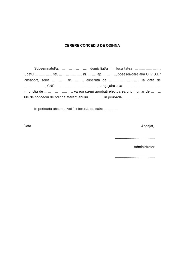 Totuşi salariaţii care se întorc mai repede din concediu fără aprobarea angajatorului sau în lipsa unor motive obiective nu pot fi lipsiţi de dreptul lor la zilele de concediu neefectuate întrucât aceasta ar putea fi privită ca o cale prin care se renunţă la dreptul de a efectua integral concediul de odihnă în natură. Oricât de mult ți ar plăcea ceea ce faci la job o perioadă de repaus este necesară și utilă. Am pastrat ac concediu de odihna special stiind ca plata primei pensii dureaza si 3 luni. Necesară pentru că te ajută să te deconectezi de la viața cotidiană și utilă pentru că după această perioadă vei fi mai eficient ă la locul de muncă dar și mai bine ancorat ă în.