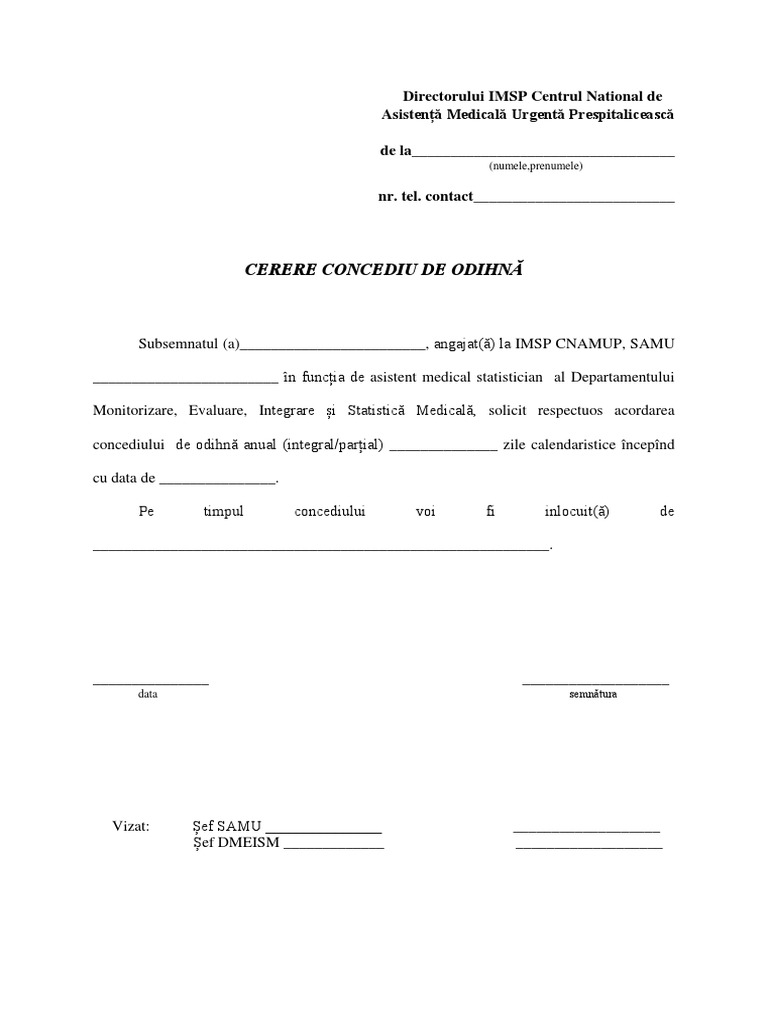Cuantumul indemnizatiei de concediu reprezinta media zilnica a drepturilor salariale rezultate prin insumarea salariului de baza a indemnizatilor si a sporurilor cu caracter. Acest concediu se acordă separat de zilele de sărbătoare legală de zilele de repaus săptămânal și chiar de zilele libere luate pentru evenimente familiale deosebite. Concediul de odihnă este mai înainte de toate un semn de respect față de propria persoană. Mentionez ca eu mai am zile de concediu de anul trecut 8 mai exact si mi s a comunicat ca in perioada 13 04 16 04 2020 voi fi in concediu.