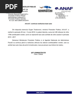 Banii pentru taxa auto nu au fost restituţi încă tuturor şoferilor în ciuda promisiunilor repetate ale ministrului de finanţe. A restituit în perioada 3 5 iunie 2019 la nivel național suma de 700 milioane de lei c ătre 420 000 contribuabili români sum ă ce reprezint ă taxe auto achitate de c ătre ace știa în. Ministerul mai informa că împreună cu anaf va continua până la restituirea ultimului leu datorat contribuabililor români care au achitat taxe auto taxe auto pentru autoturisme și autovehicule taxa pe poluare taxa pentru emisiile poluante provenite de la autovehicule sau timbrul de mediu.
